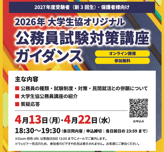 「2026年 大学生協オリジナル 公務員試験対策講座 ガイダンス(4月)」最終開催!