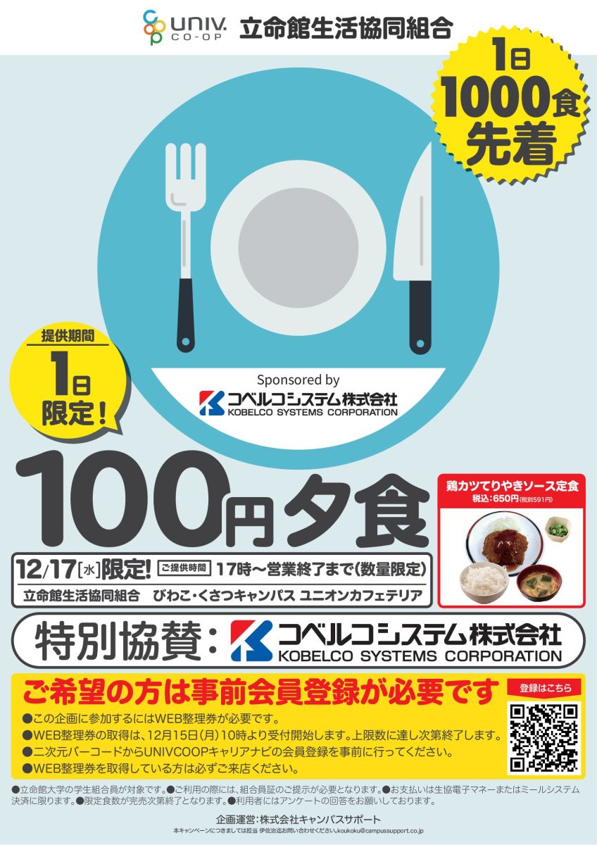 11月に開催し多くのご利用をいただいた100円夕食が再び開催!冬も毎日頑張る学生のあなたに食生活応援企画