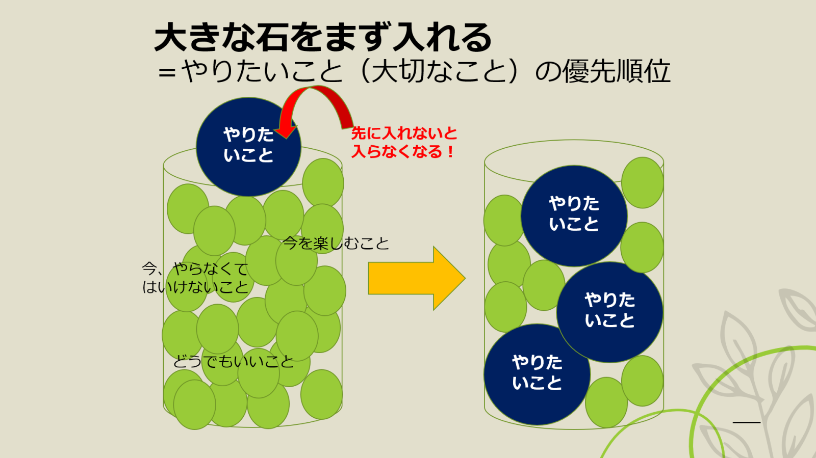 ですので、まず大きなやりたいこと(海外留学や資格の勉強など)を計画に入れていただいて、その合間にアルバイトなど細々したことを積み重ねていくのがおすすめです。