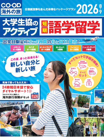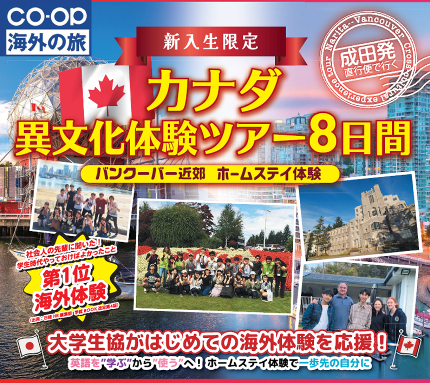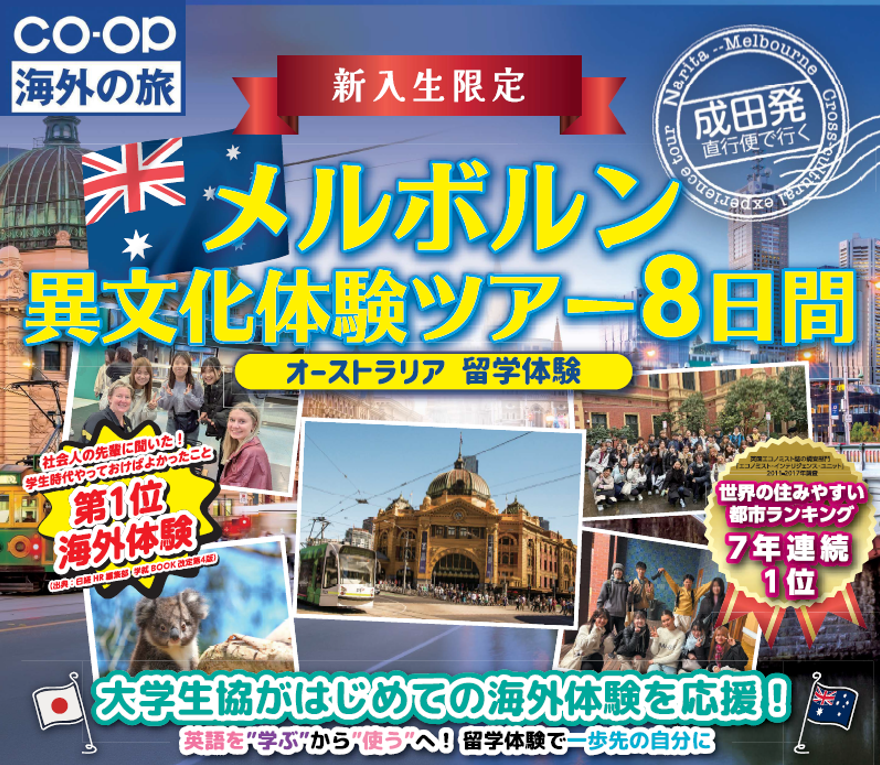 生協では、新入生限定の異文化体験プログラムとして、【メルボルン異文化体験ツアー】と【カナダ異文化体験ツアー】の2つをご紹介しています。これらは「いきなり長期留学は不安」という方に、初めての海外体験として最適なプログラムです。