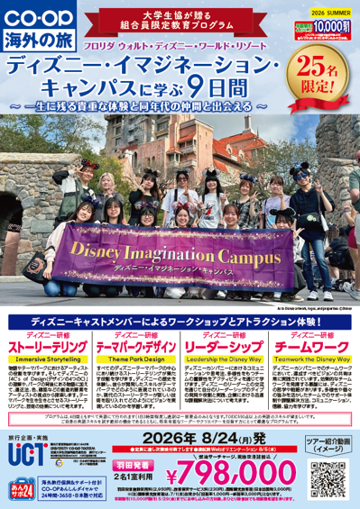 そのほか、3週間〜1・2か月の短期留学であれば、航空券や海外旅行保険などがセットになったパッケージ型の【アクティブ】もおすすめです。海外体験プログラムとしては、フロリダのディズニーワールドでワークショップを経験できる【ディズニー・イマジネーション・キャンパス】も人気です。