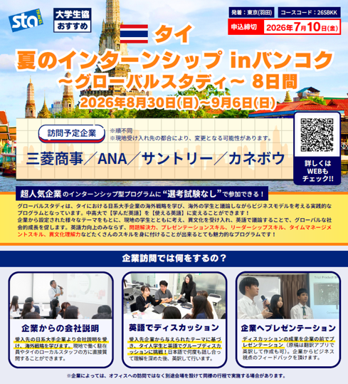 急に留学に行きたくなった場合は、生協の商品については特に説明会に出ていなくても、急に思い立って申し込むことが可能です。ただし、商品によって出発の設定が異なるので、ぜひ生協に相談に来てください。一方、大学の学科プログラムは、事前準備や事後学習が組み込まれており、ガイダンス参加が必須のものがほとんどですので、早めの情報収集をおすすめします。