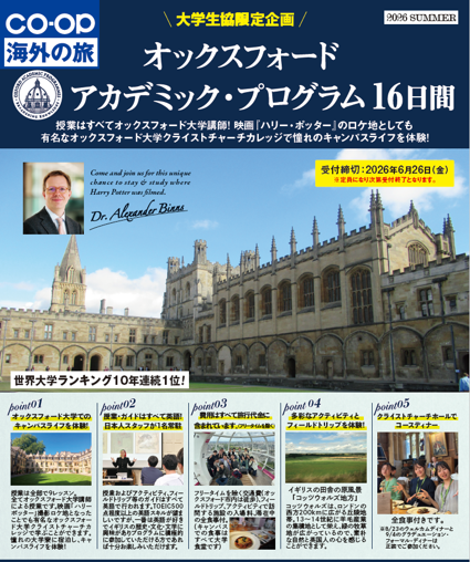 また、ひとつのテーマに沿って計画される【テーマのある旅】では、教育視察やピーススタディなど、普通の旅行では行けないような場所に専門ガイドの案内で訪問できます。さらにレベルが上がりますが、海外で日系大手企業の海外戦略を学び、海外の学生と議論する【グローバルスタディ】や、イギリスのオックスフォード大学のキャンパスで現役の先生から授業を受ける【オックスフォード】プログラムもあります。
