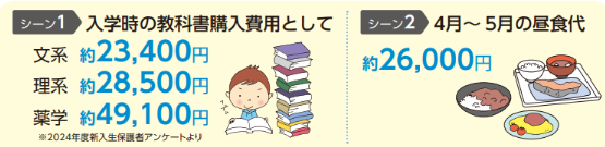 必要な金額を入学前にチャージ(入金)しておけば、授業に必要な教科書や文具が入学後すぐに購入できます。