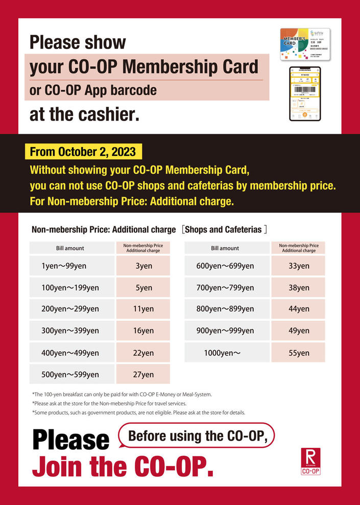 ②組合員証の呈示がない場合は、組合員価格でご利用いただけません。アプリ決済もしくは組合員カードの呈示をお願いします。